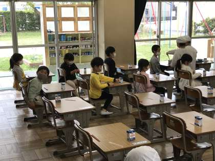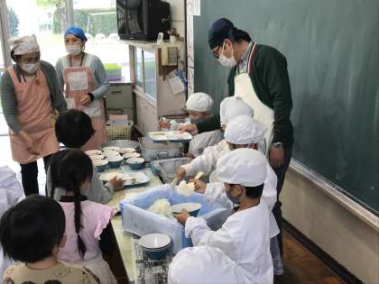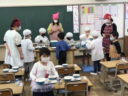当番を中心に配膳をする様子です。当番以外は,席について静かに待っています。