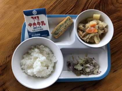 ごはん・牛乳・あいちのあつやきたまご・にくじゃが・キャベツのゆかりあえ