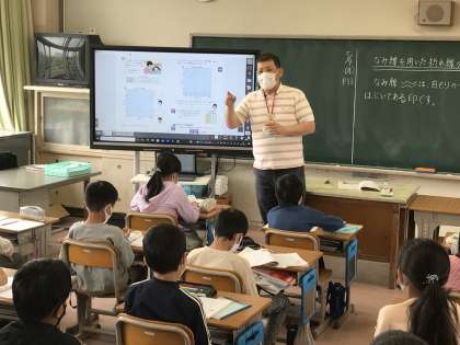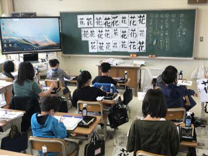書写の毛筆や折れ線グラフについて学習する様子です。