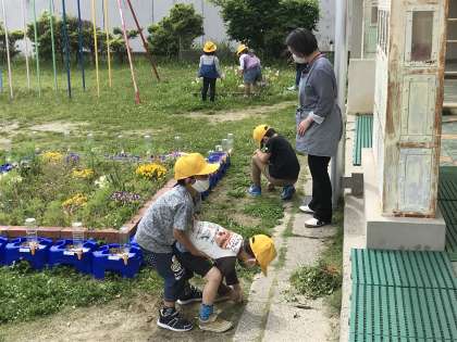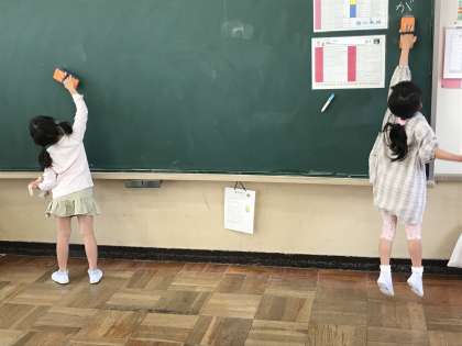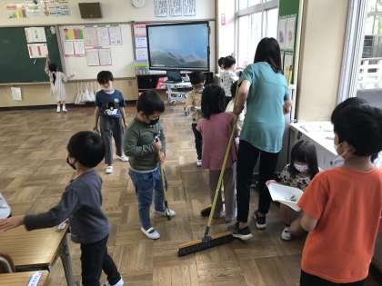 感染症対策のため,6年生との交流を取りやめ,1年生だけで掃除に取り組む様子です。