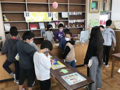 図書委員会の児童が朝から図書館のお仕事に取り組む様子です。