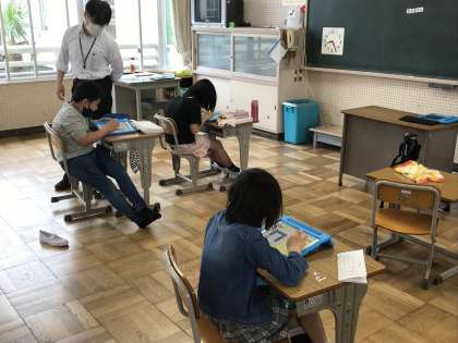 ICT支援員を活用し,タブレット端末の活用方法を学んでいる様子です。