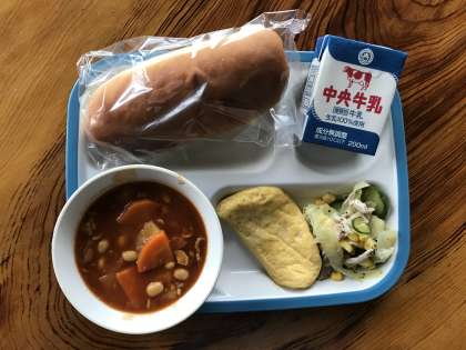 ミルクロールパン・牛乳・ポークビーンズ・オムレツ・ハムとやさいのマリネ