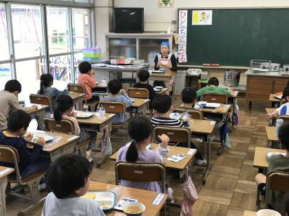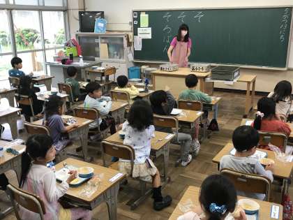 静かに前向き給食に取り組む様子です。