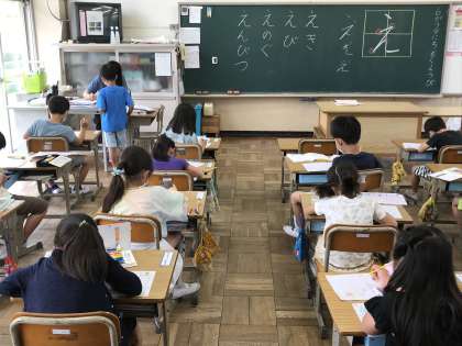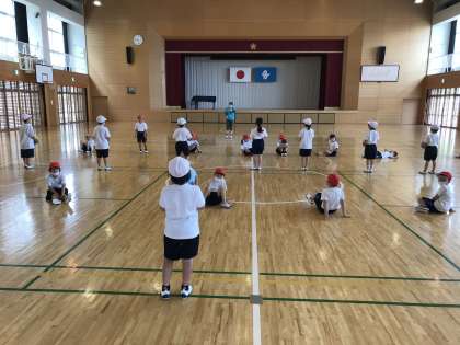 ひらがなの練習や体育のボール遊び運動に取り組む様子です。