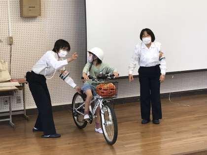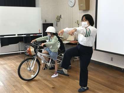 後半戦は,自転車の乗り方について説明がありました。代表児童をお手本にして,交通指導員の方々から分かりやすくお話いただきました。