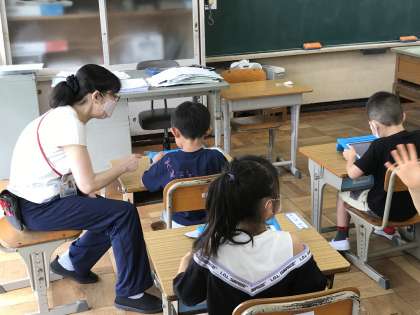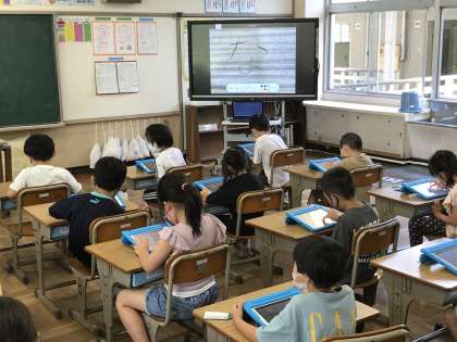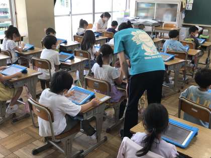 タブレット端末を活用して,ひらがなを書く学習に取り組む様子です。