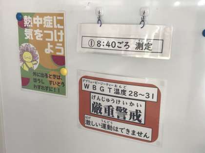 昇降口にWBGT指数を示し,注意喚起を行っています。