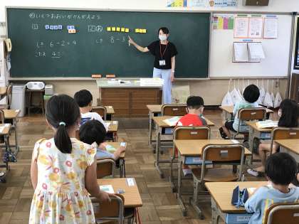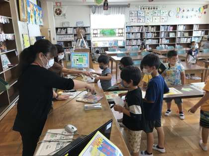 図書館を利用して本を借りたり,算数のひき算について学習したりする様子です。