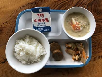 ごはん・牛乳・レバーいりしろごまつくね2個・きりぼしだいこんのごまあぶらいため・ごじる