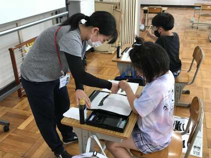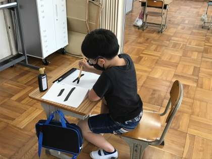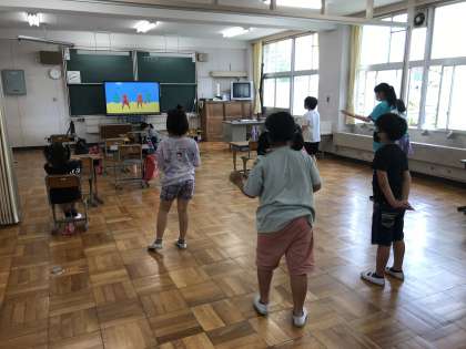 書写の毛筆に取り組んだり,映像を見ながらダンスに取り組んだりする様子です。