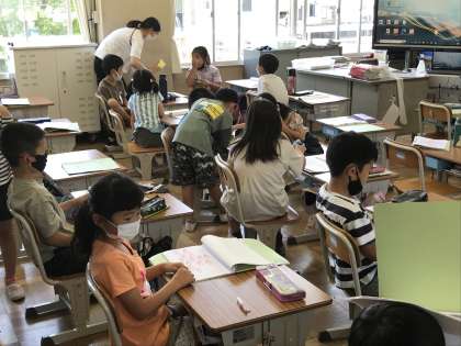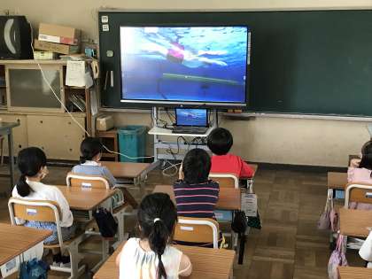 国語の学習に取り組んだり,映像を見て泳ぎ方をイメージしたりする様子です。