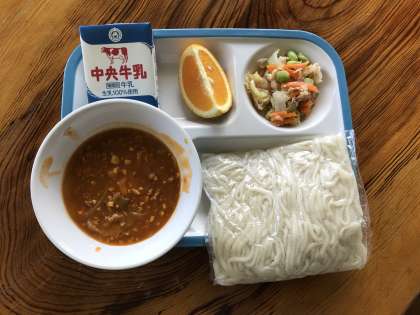 ソフトめん・牛乳・ミートソース・えだまめとにんじんのサラダ・オレンジ