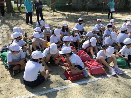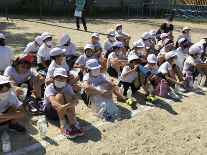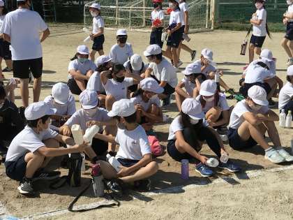 水分補給したり,応援グッズの使い方を確認したりする様子です。