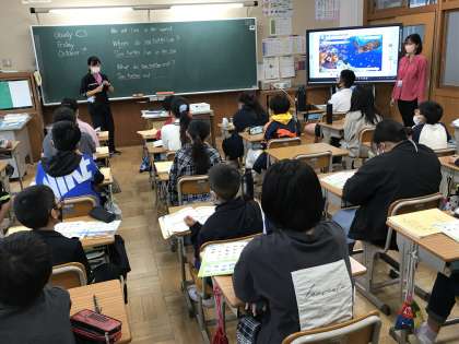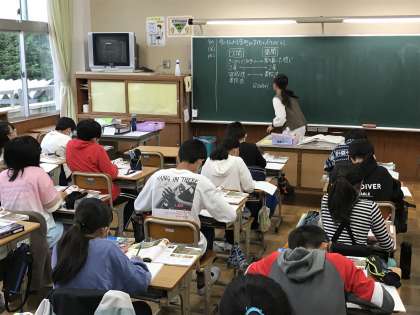 教科分担制による外国語・社会の学習に取り組む様子です。