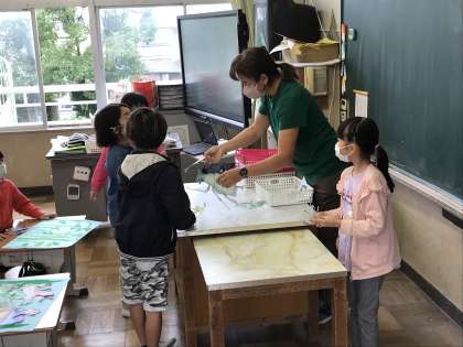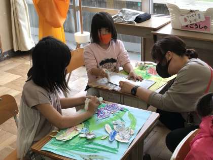 作った昆虫を貼り付けて作品の完成を目指す様子です。