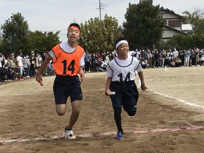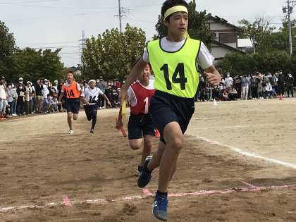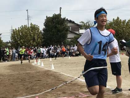 青チームが最初にゴールテープを切りました。どのチームも最後まであきらめず,一生懸命走り切ることができました。リレー選手一人ひとりが輝いていました。