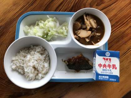 むぎごはん・牛乳・さばのおろしかけ・ぶたじる・キャベツのたくあんあえ