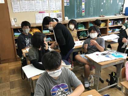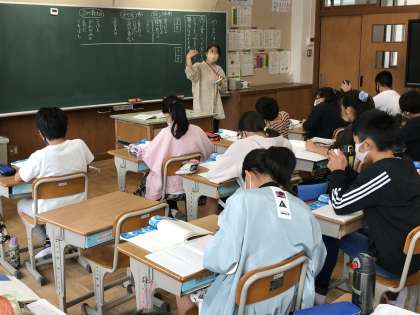国語の「やまなし」についての学習や家庭科のエプロン作りに取り組む様子です。
