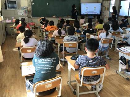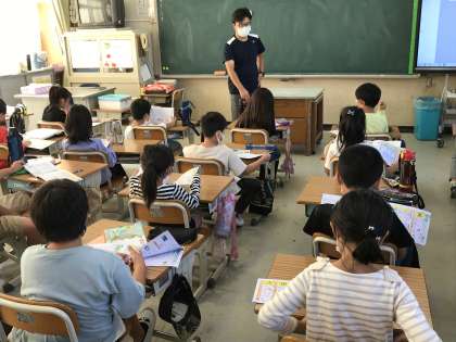ALTの先生と外国語活動に取り組んだり,漢字の学習に取り組んだりする様子です。