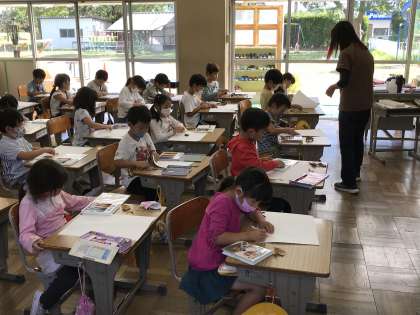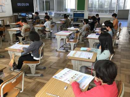 算数のテストに取り組んだり,落ち葉を活用した作品作りに取り組んだりする様子です。