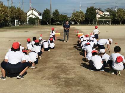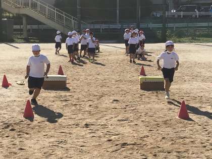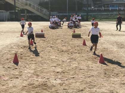小型ハードルに取り組む様子です。運動するには,暑いくらいの陽気です。