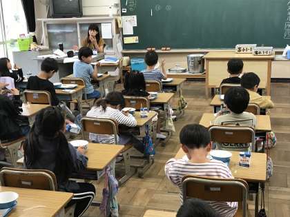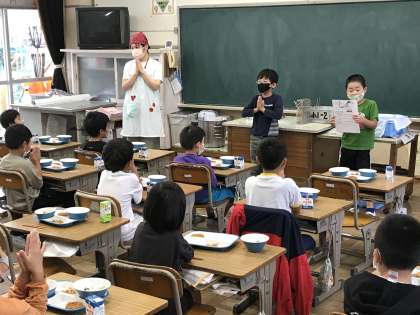 日直の号令でいただきますをしたり,前向き黙食をしたりする様子です。