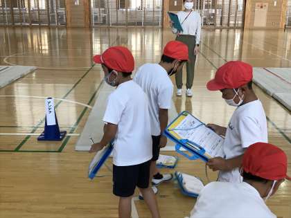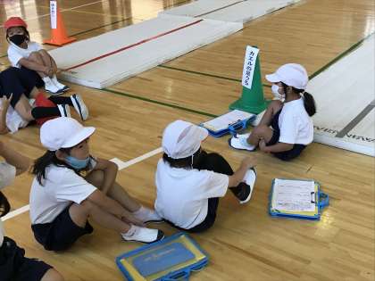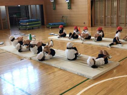 マットを使った運動遊びにおいて,グループに分かれてゆりかご練習をする様子です。