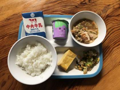 ごはん・牛乳・あつやきたまご・ひきずり・おかかあえ・ぶどうゼリー