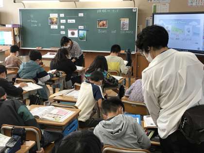 外国語の学習に取り組んだり,学年集会で校外学習のグループ分けをしたりする様子です。