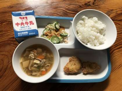 ごはん・牛乳・あじフリッター・バンバンジーサラダ(バンバンジードレッシング)・はっぽうたん