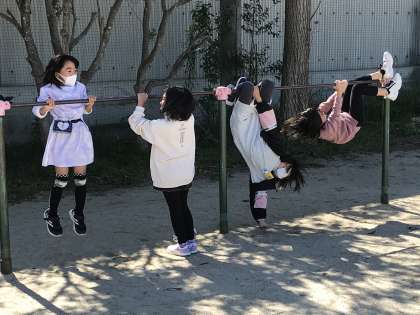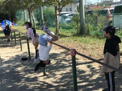 鉄棒で外遊びを楽しむ姿が見られました。