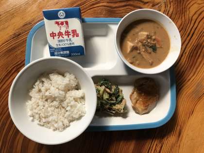 むぎごはん・牛乳・とりにくのてりやき・こまつなのごまあえ・とうにゅういりみそしる