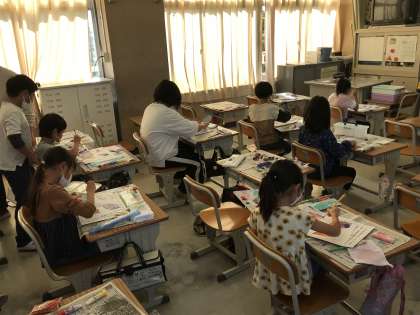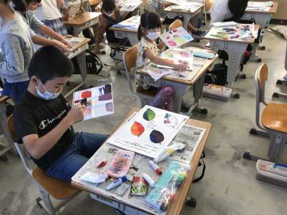 いろいろな色を作りだして,葉っぱに色を付ける様子です。