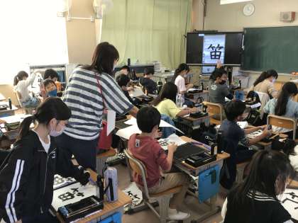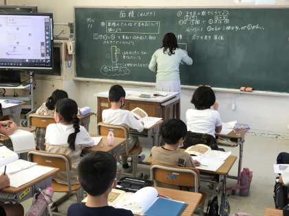 算数の「面積」について学習したり,毛筆で「笛」の練習に取り組んだりする様子です。