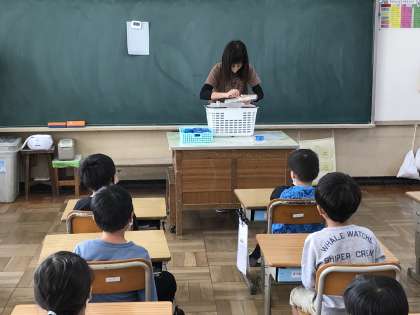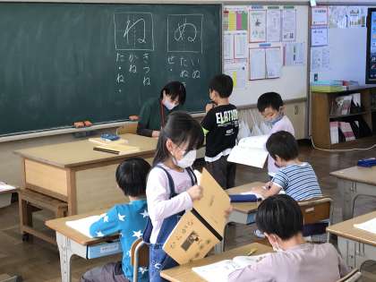 担任を入れ替え,水書に取り組んだり,ひらがなの練習に取り組んだりする様子です。