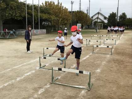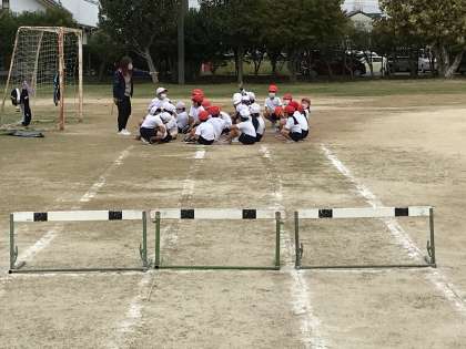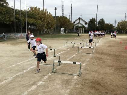 グラウンドで小型ハードルの練習に取り組む様子です。
