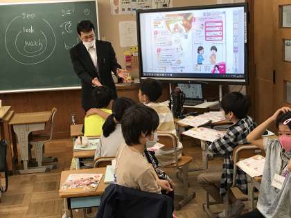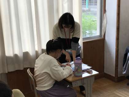 外国語の学習に取り組む様子です。ALTのクリスティーナ先生が個別対応を丁寧にしている様子も見られました。