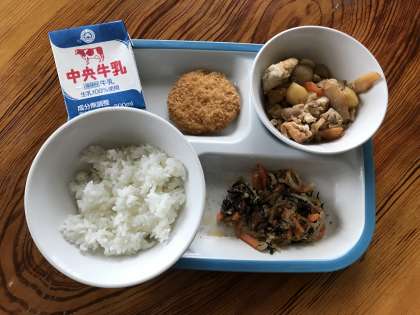 ごはん・牛乳・れんこんサンドフライ・あきやさいのうまに・ひじきのごまずあえ