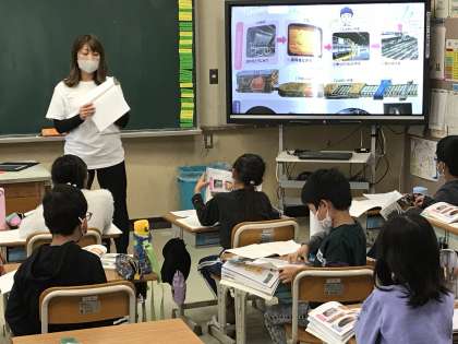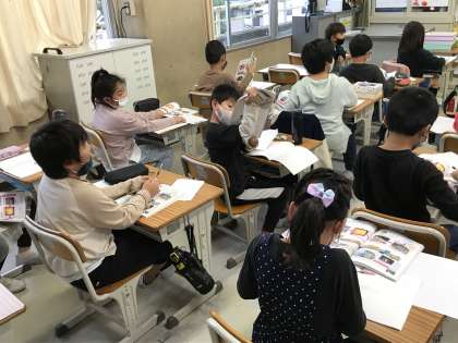 教科分担制による社会の学習に取り組む様子です。今日の出前授業に関連付けて学習を進めていました。