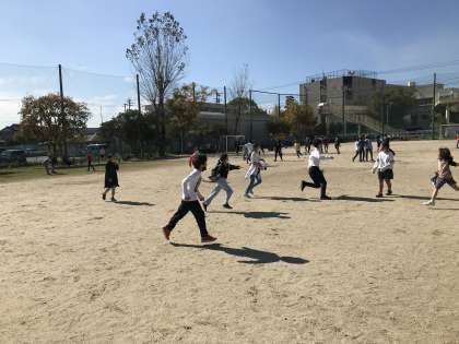 気温も上がり,運動するには暑いくらいです。先生も一緒に鬼ごっこをする姿も見られました。
