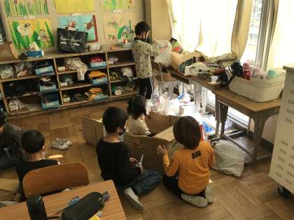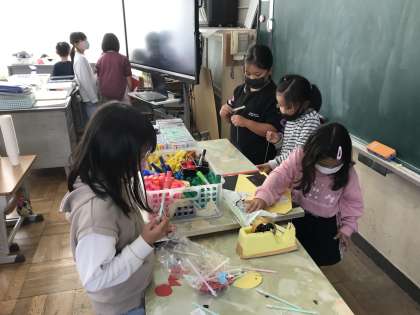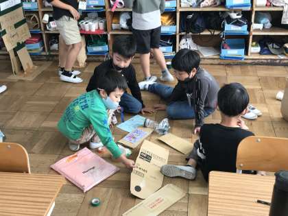 おもちゃ作りに夢中になる様子です。みんなで協力して頑張っています。