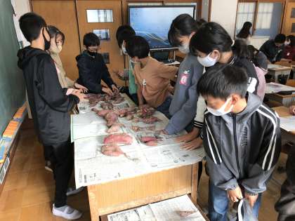 収穫したサツマイモを机上に並べ,分配する準備をしていました。