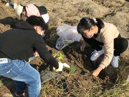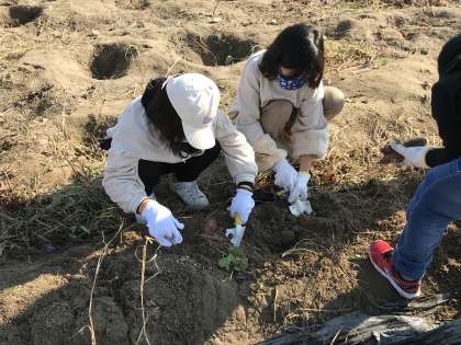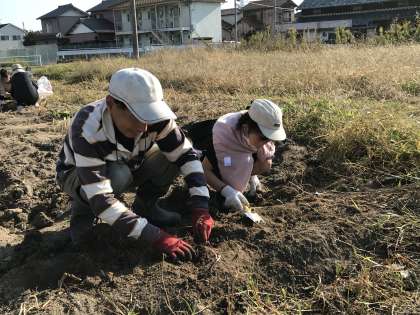 みんなで仲良くサツマイモの収穫に取り組む様子です。