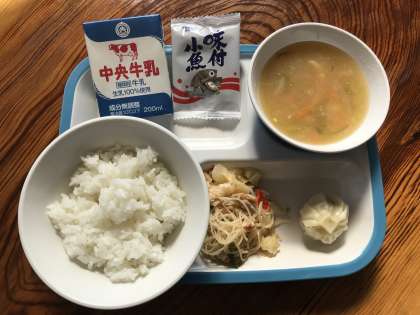ごはん・牛乳・ショーロンポー・ビーフンいため・ちゅうかコーンスープ・かんそうこざかな