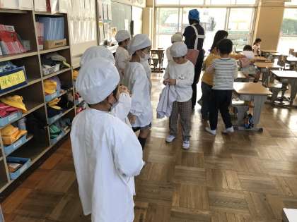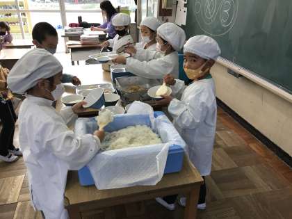 白衣に着替えて準備に取りかかり,手際よく配膳する様子です。