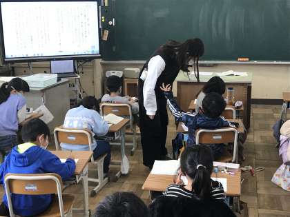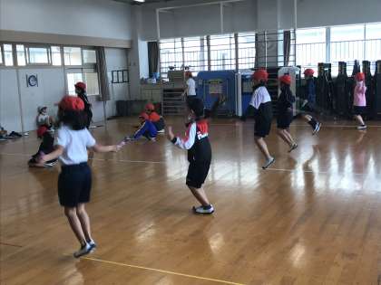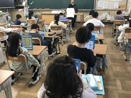 タブレット端末を活用した学習や国語・体育の学習に取り組む様子です。