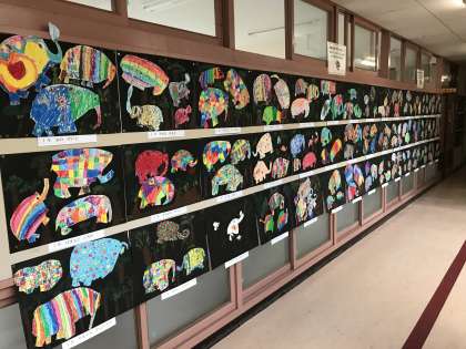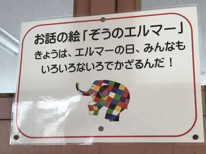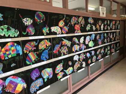 調理室の廊下掲示板に「ぞうのエルマー」の作品が展示されています。明日からの懇談会の折には,ぜひご覧ください。