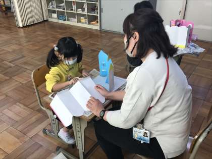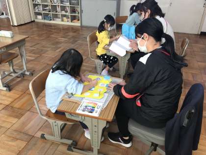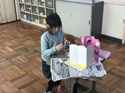 図工「まどからこんにちは」の作成に集中して取り組む様子です。