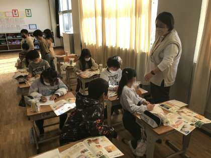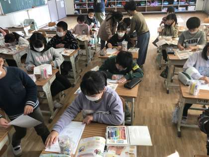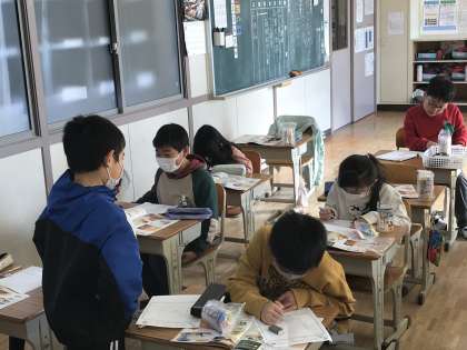 図工「空き容器の変身」の作品作りに取り組む様子です。